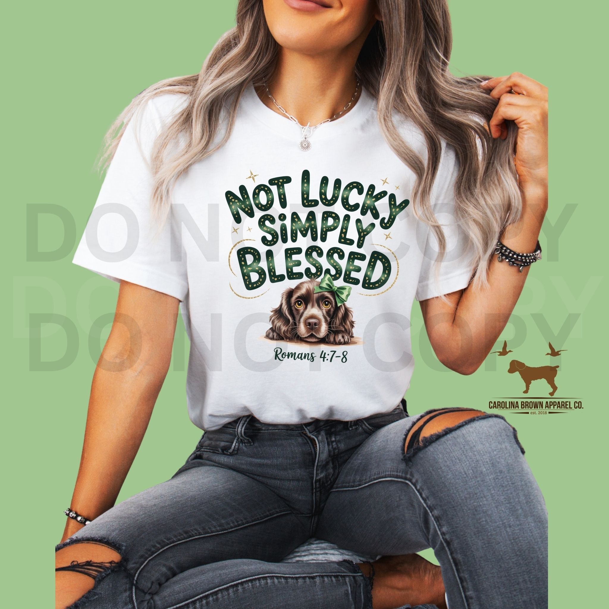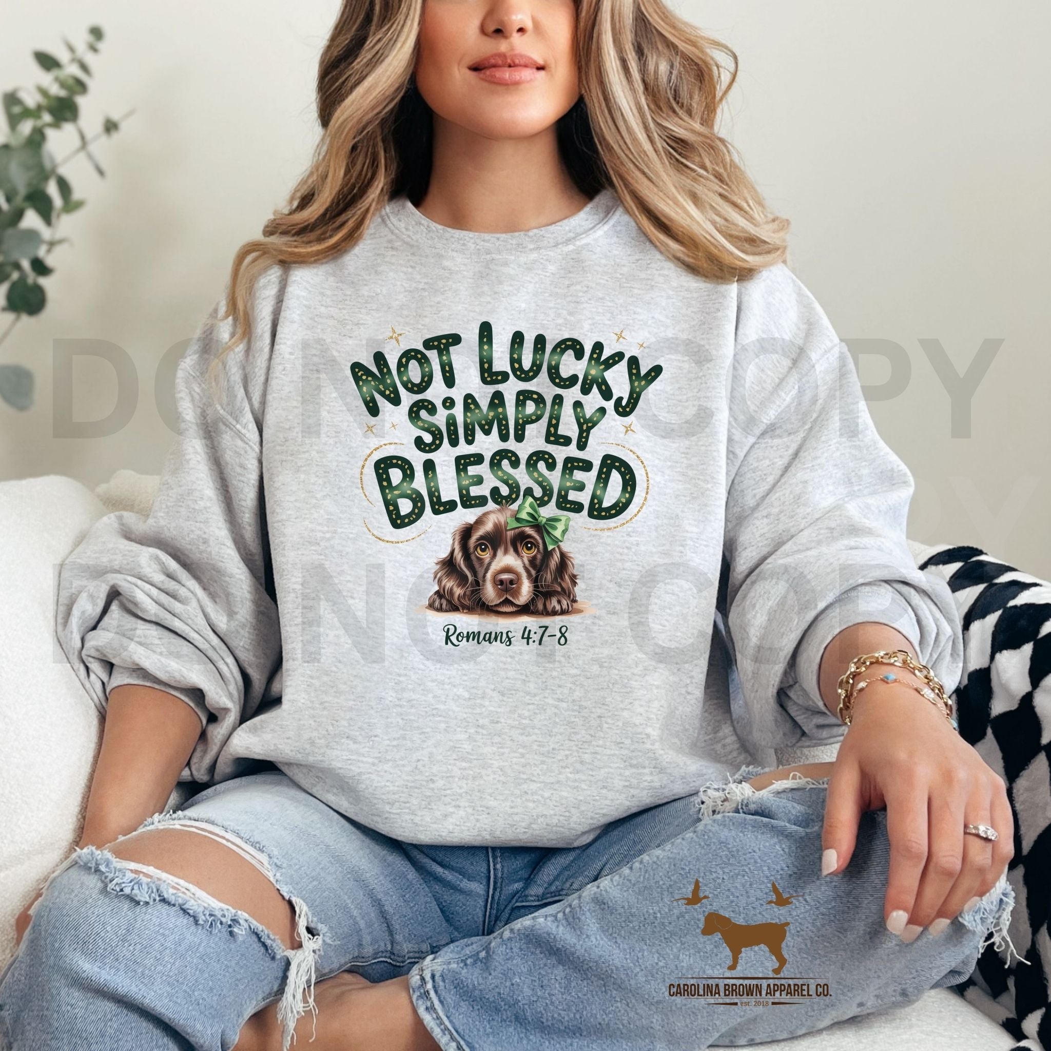 Boykin Spaniel, Not Lucky Simply Blessed unisex t-shirt and sweatshirt. Check out all of our southern bird dog, duck dog, little brown dog, Spaniel merchandise.